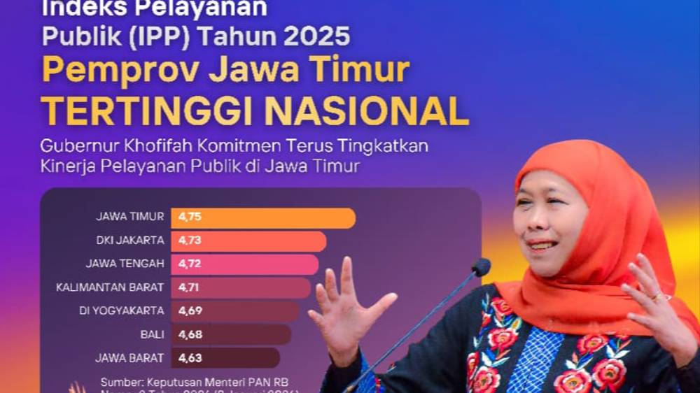 “Alhamdulillah, berdasarkan penetapan Kementerian PANRB, Jawa Timur dinyatakan sebagai provinsi dengan kinerja pelayanan publik terbaik tahun 2025. Ini bukan sekadar prestasi, tetapi amanah untuk terus menjaga dan meningkatkan kualitas pelayanan kepada masyarakat,” kata Khofifah di Surabaya, Senen (12/1).